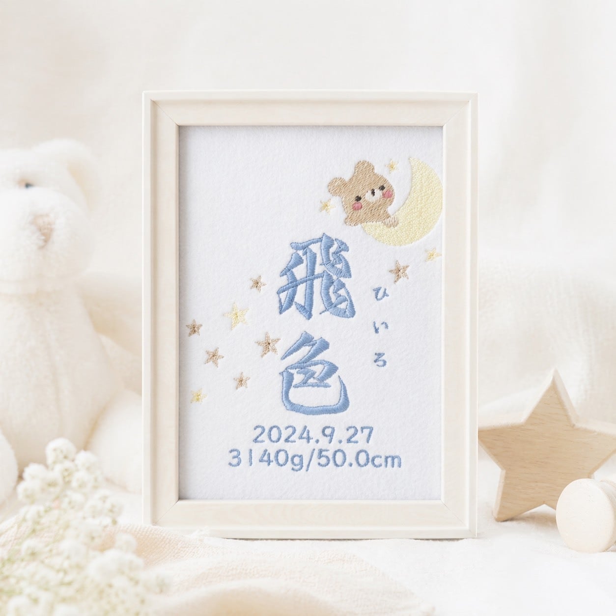 くま×月×星 出産祝いにも 刺繍命名書