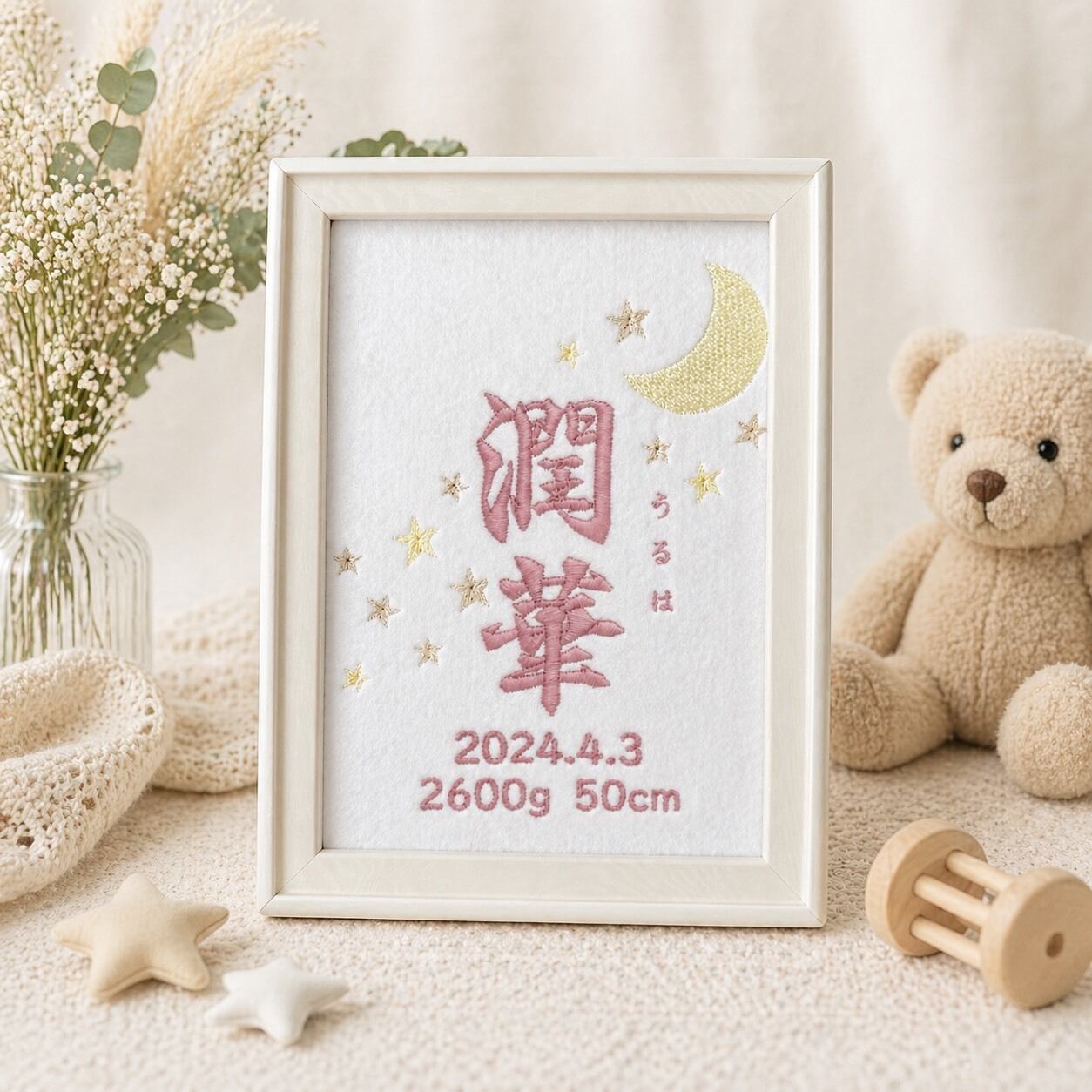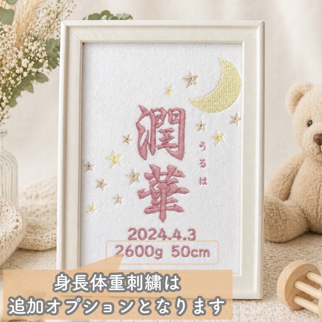 ピンク 月×星 出産祝いにも 刺繍命名書
