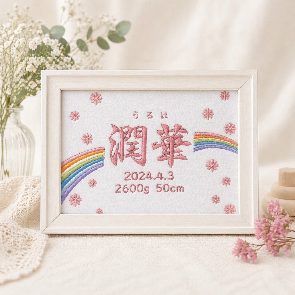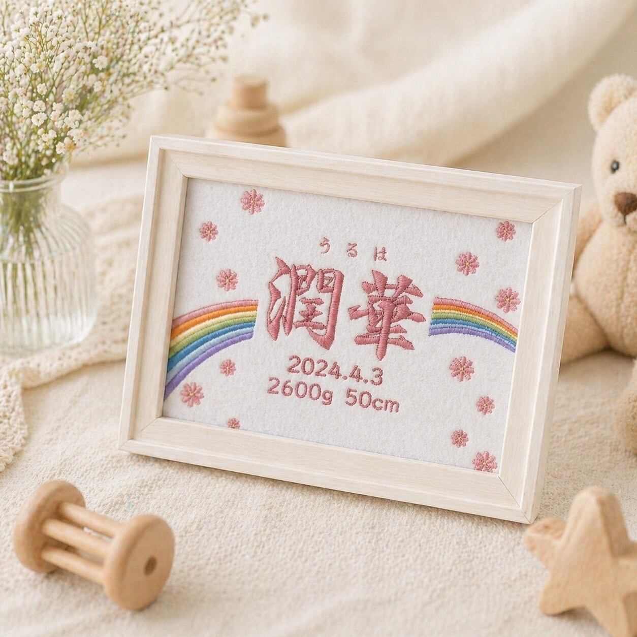 虹×花 出産祝いにも 刺繍命名書